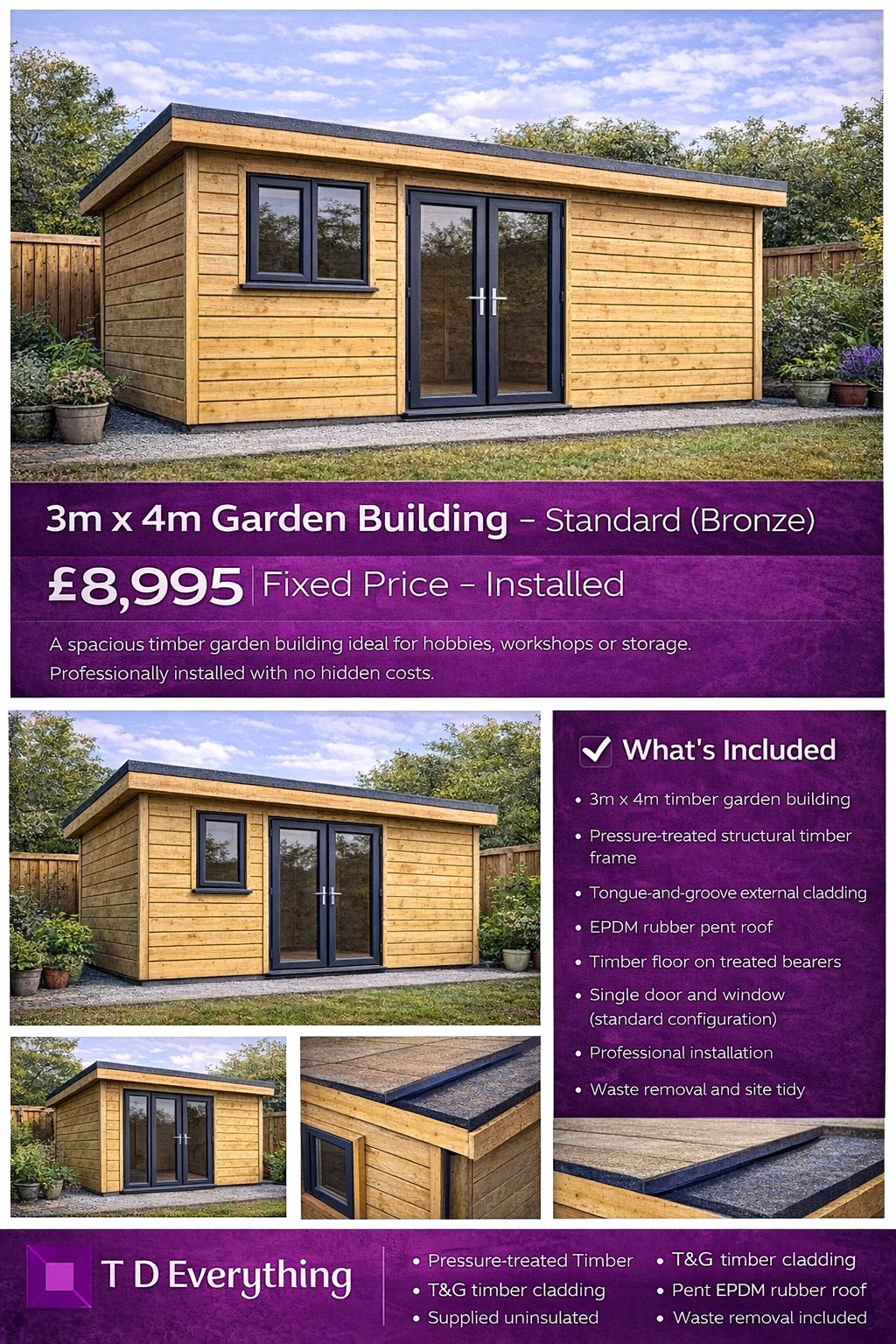 The 3m x 4m Standard Garden Building (Bronze) is our most popular size, offering a practical balance of space, durability and value. It’s ideal for homeowners looking for a reliable, professionally installed garden building without stepping into insulated or bespoke pricing.